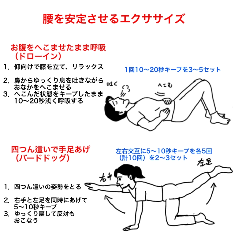 ドローイン(お腹を軽くへこませたまま呼吸するトレーニング)や四つ這いでのエクササイズ(バードドッグ)がおすすめです。