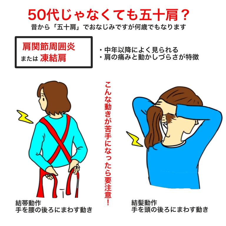 五十肩では手を頭の後ろにまわす「結髪動作」や腰の後ろにまわす「結帯動作」がしづらくなり、衣服の着替えや入浴時など日常的な動作に支障が出ます。また横向き寝や寝返りをうつ時に痛みが出ると安眠の妨げになるでしょう。