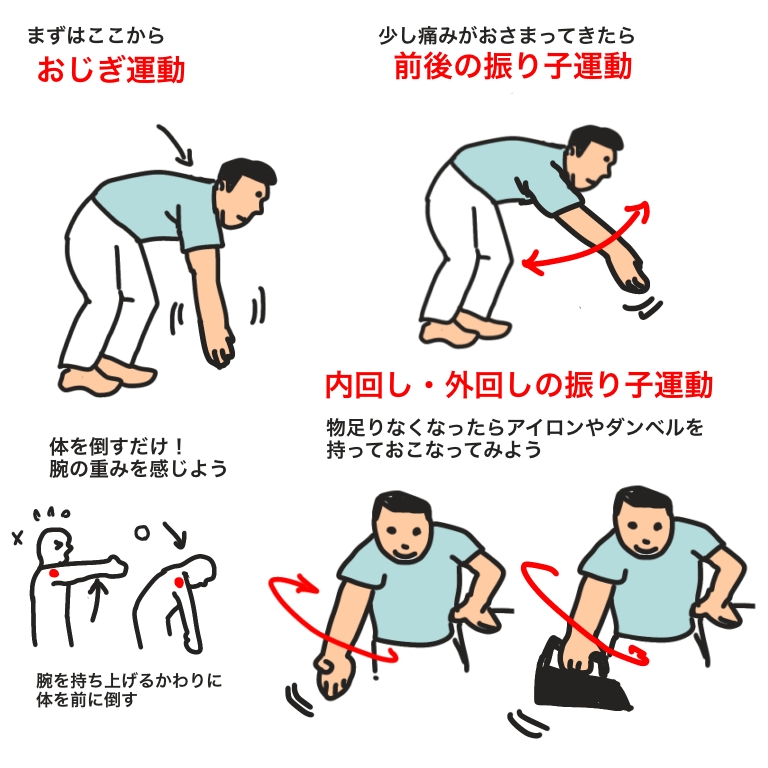 痛みの強い時期は安静が基本ですが、可能な範囲で動かします。痛くて腕を上げることができないときは腰を曲げて腕をだらりと下げるだけの「おじぎ運動」からはじめましょう。腕を前にあげずに体の方を動かして方のまわりをストレッチできます。