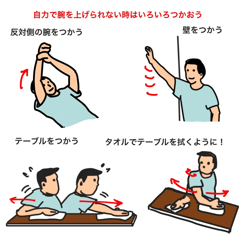 痛みがあるとき無理は禁物ですが、関節が固まって可動域が狭くなるのを防ぐため肩を動かしていくことはとても大切です。