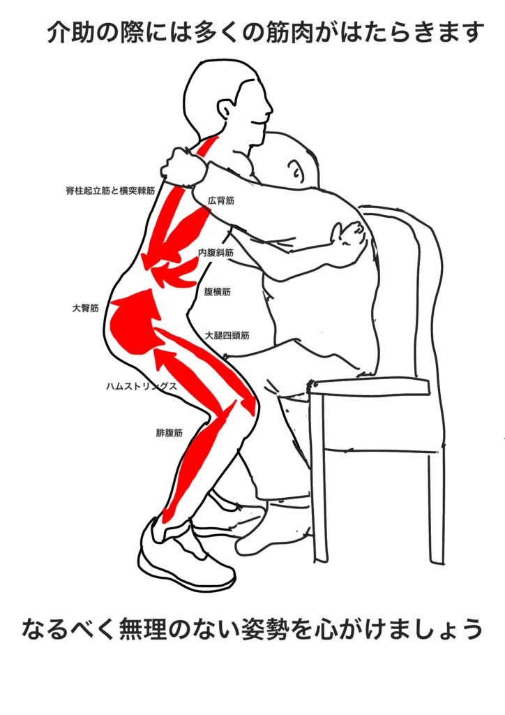 介助の際には正しい姿勢でおこない、なるべく負担を減らすことが大切です。