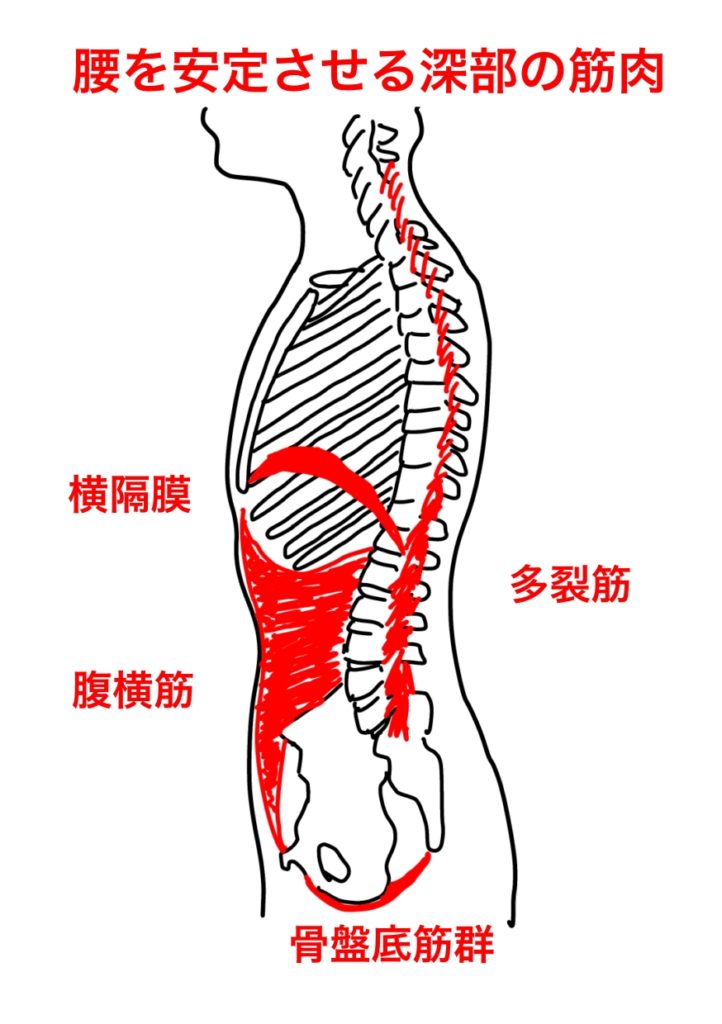 腰に不安があるとき補助的にコルセットを着用して腰部を安定させますが、コルセットの役割をする筋肉を意識・強化するという考え方です。セルフコルセットなどと呼ばれるのを聞いたことがある方もいるかもしれません。具体的には腹横筋、多裂筋、骨盤底筋、横隔膜腰の安定した姿勢を維持するのにはたらきます。