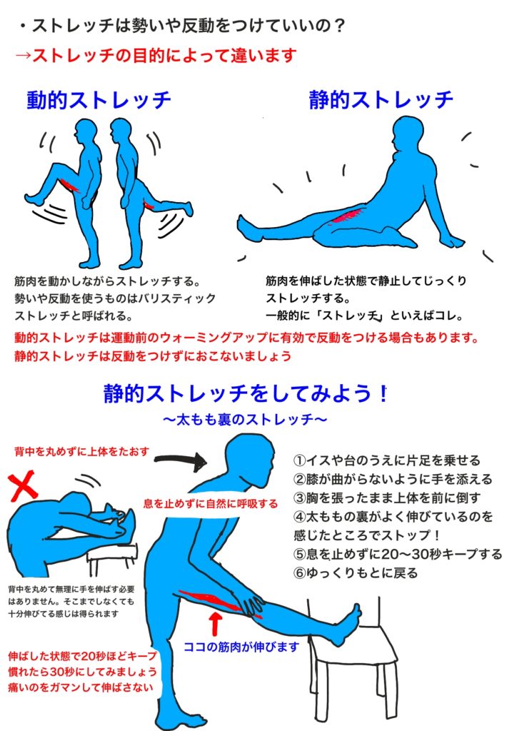 一般にストレッチというと図にある「静的ストレッチ」(スタティック・ストレッチング)を指すことが多いのですが、その場合は反動はつけずにおこなってください。