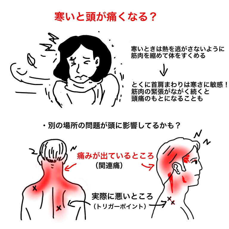 寒い季節の頭痛は、首や肩の筋肉の緊張+自律神経の乱れが原因のことが多い。